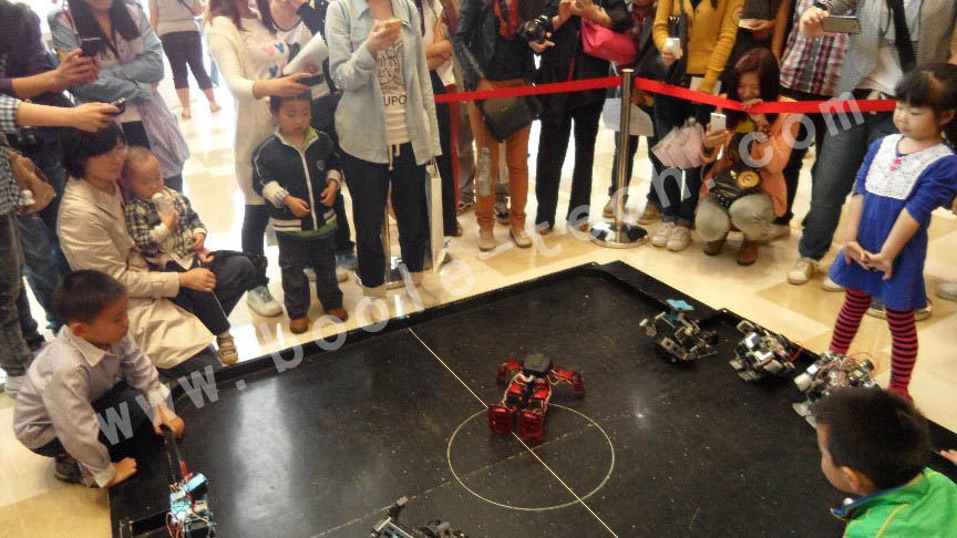 機(jī)器人足球比賽是一個(gè)互動(dòng)性很強(qiáng)的環(huán)節(jié),同學(xué)們可以遙控機(jī)器人行走、踢球、撲球、甚至跌到了,還會(huì)迅速爬起來(lái)繼續(xù)作戰(zhàn)!現(xiàn)場(chǎng)不斷傳出一陣陣的歡呼聲。
