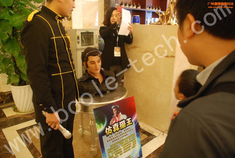 按照已故天王巨星“貓王”外表設(shè)計(jì),1:1還原,無(wú)論是發(fā)型、臉型、皮膚,甚至是衣服也頗有當(dāng)代歌星的特征!高仿真機(jī)器人“貓王”主要有兩大功能:唱歌,說(shuō)話。通過(guò)遙控器控制,可讓機(jī)器人唱歌,期間機(jī)器人頭部會(huì)擺動(dòng),嘴巴會(huì)張合,甚至連眼睛、眉毛、嘴角等細(xì)節(jié)動(dòng)作也能突顯出來(lái)!