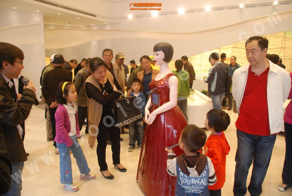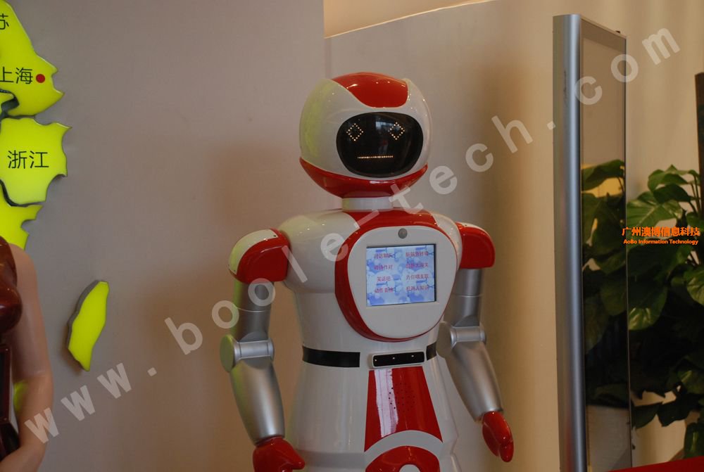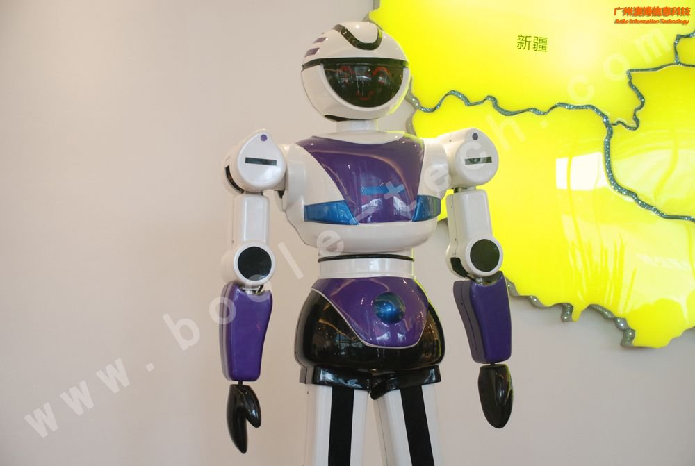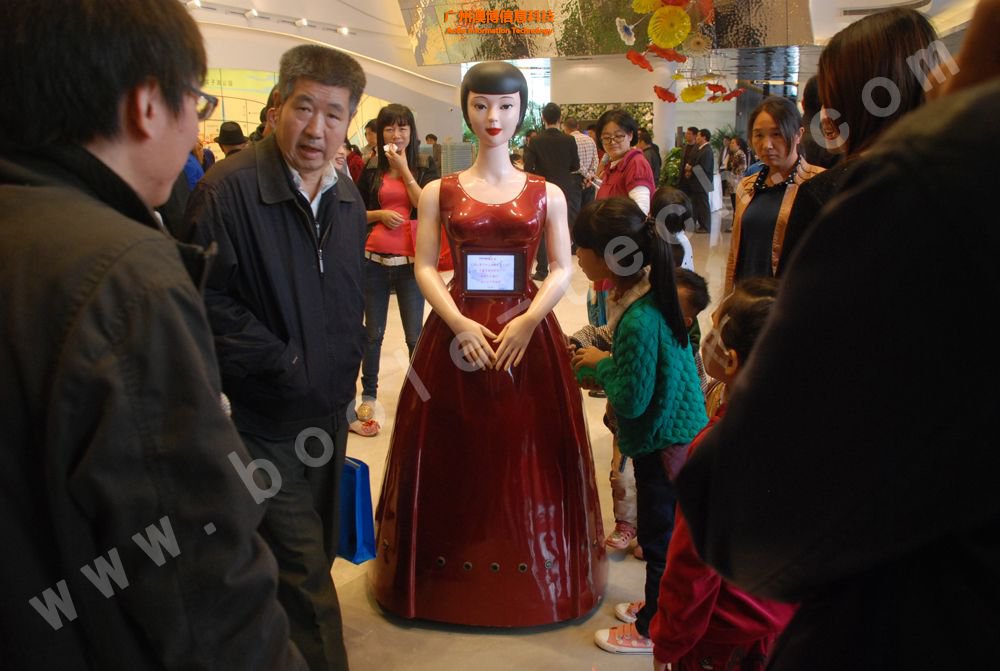 這是一款美女外形的迎賓機器人,曾經上過中央電視臺CCTV10科技頻道,其胸前有一塊屏幕,能展示相應的信息,機器人擁有語音識別功能,能夠與觀眾對話。機器人底部有多個傳感器,能自動避開障礙,并能按照預先設定的路線行走。